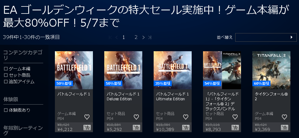 EA ゴールデンウィークの特大セール実施中!ゲーム本編が最大80%OFF!5/7まで